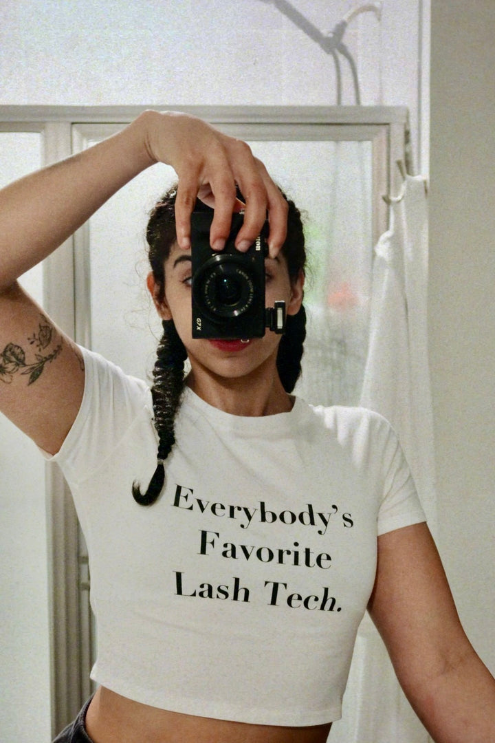 Turn heads inside and outside the lash room with our signature white crop top featuring the bold statement: “Everybody’s Favorite Lash Tech.” Designed for confidence and comfort, this fitted tee is perfect for showing off your lash boss energy while keeping it stylish.